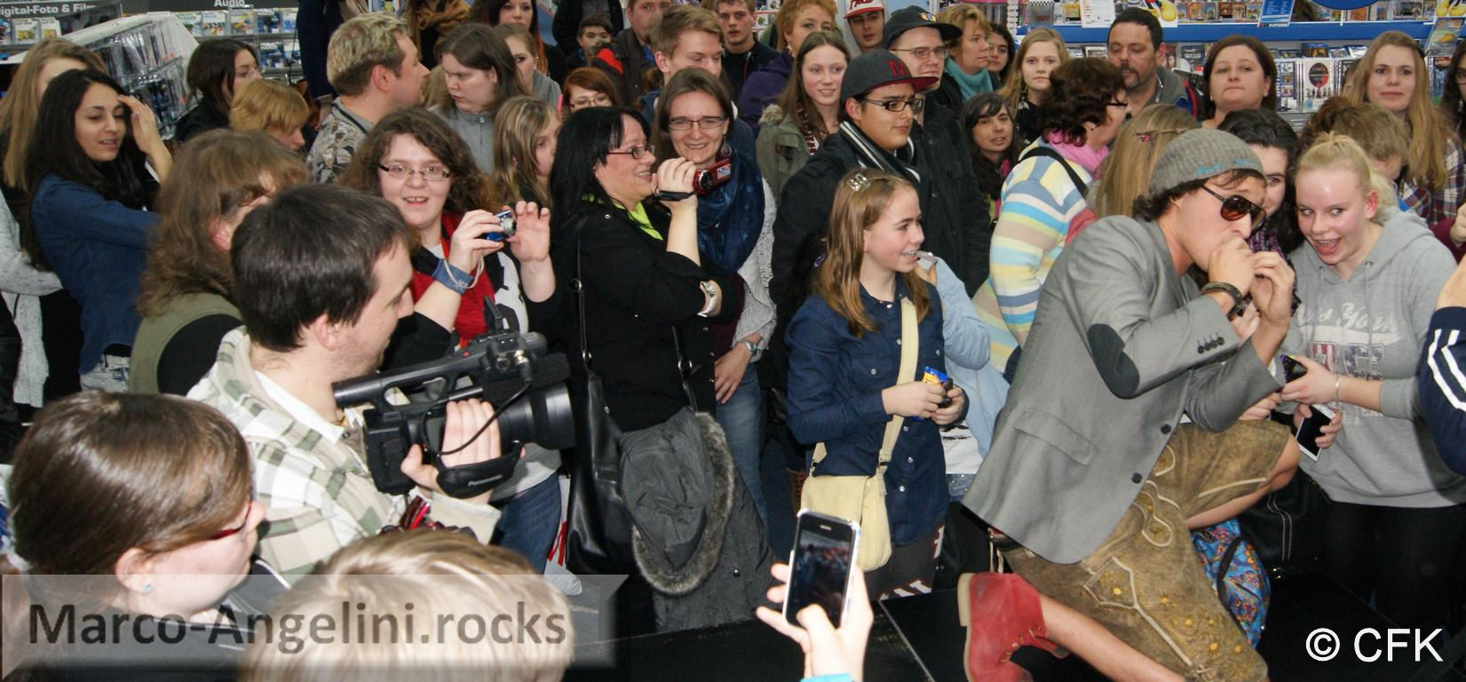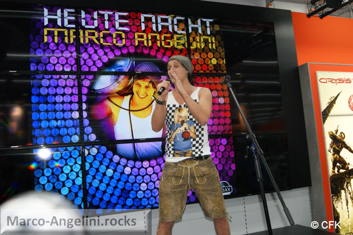 Wie erwartet, musste der Auftritt in Berlin-Steglitz um fast eine Stunde verschoben werden. Aber dann kamen die Zuschauer, die geduldig ausgeharrt und ihre Plätze verteidigt hatten, ebenfalls auf ihre Kosten und erlebten die Liveversion des aktuellen Partykrachers zusammen mit ein paar anderen Songs aus Marcos Repertoire.