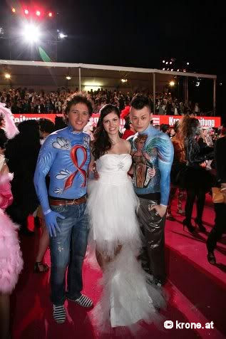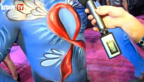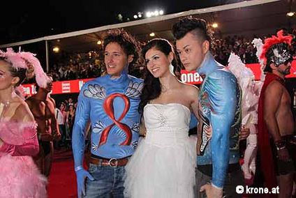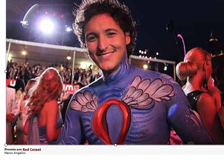 Der 19. Life Ball am Wiener Rathausplatz zugunsten der AIDS-Hilfe hatte „Spread the Wings of Tolerance“ zum Thema, und die Gäste erschienen dementsprechend größtenteils in phantasievollen Kostümen wie erotische Götter, Engel, Wolken oder Regenbögen. Ganz wenige allerdings trauten sich auf den in diesem Falle nicht roten, sondern magentafarbenen Teppich mit reduzierten Textilien, was man auf den ersten Blick allerdings nicht erkennen konnte – Marco war einer von nur zwei Prominenten, die am Oberkörper lediglich mit Bodypainting auftraten, wofür er sich anderthalb Stunden lang hatte bemalen lassen.