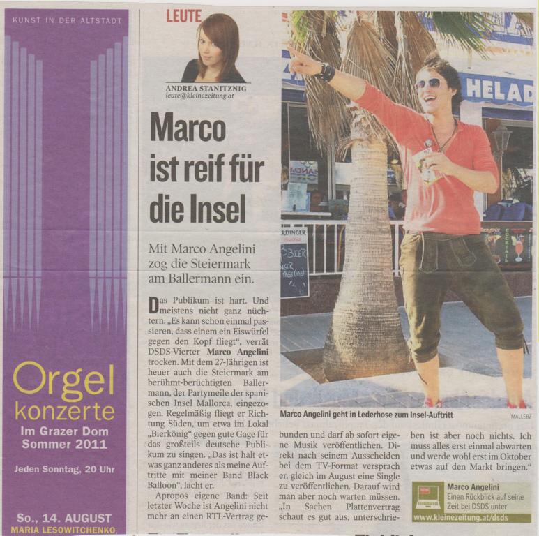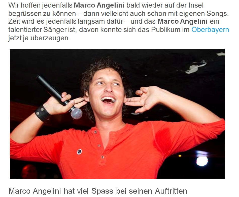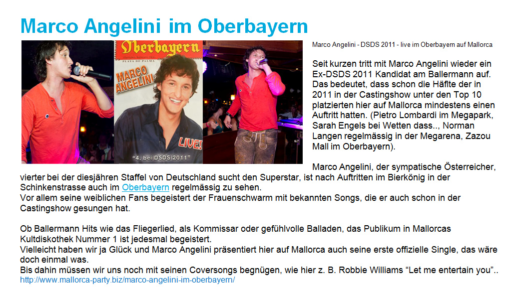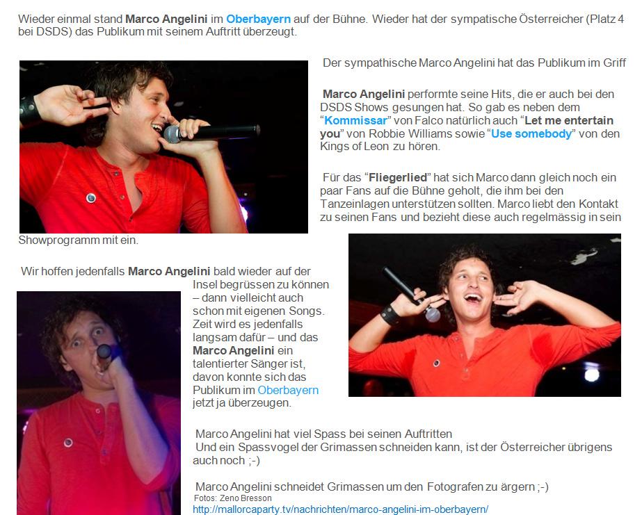 Zwischen Marcos viele Verpflichtungen nach dem Finale von DSDS mischten sich etliche Auftritte auf Mallorca, von denen hier nur einige aufgeführt werden können. Bis 2013 zog sich das Engagement, weil Marco ein Garant für Stimmung, Zuverlässigkeit und Top-Performance war und damit auch eine sichere Bank für die Veranstalter.