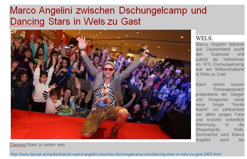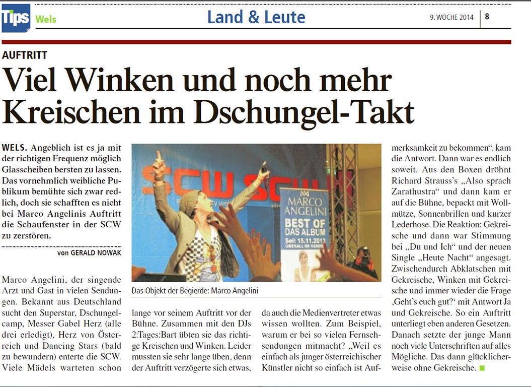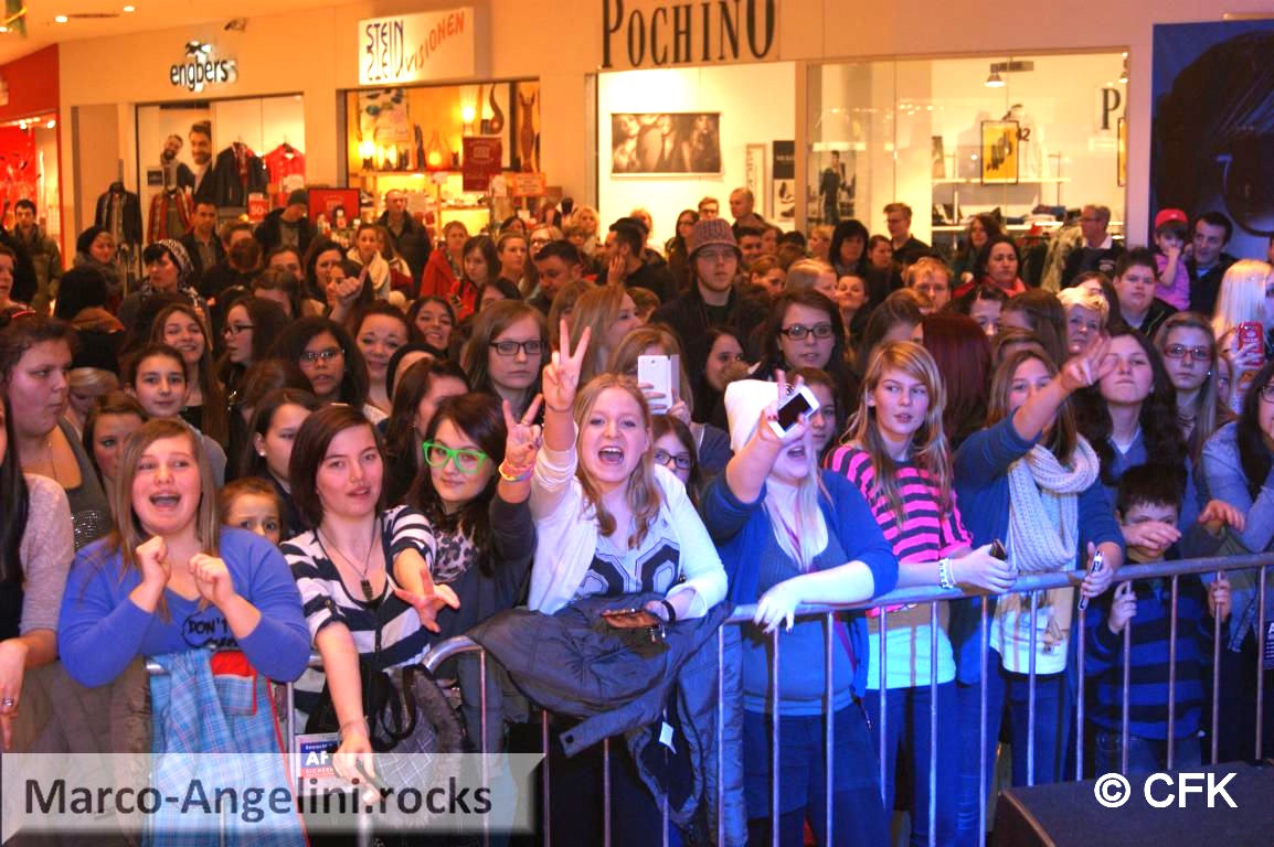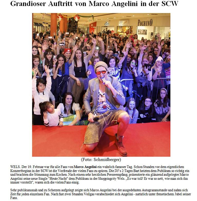 Viele der vor der Absperrung wartenden Besucher erinnerten sich gut an Marcos Auftritt hier drei Jahre zuvor mit Black Balloon, als die Shopping City Wels aus allen Nähten zu platzen drohte. Der Entschluss, frühzeitig vor dem angekündigten Auftritt dort zu sein, erwies sich als goldrichtig, nachdem bereits zwei Stunden vorher ein großer Teil der Zuschauer seine Plätze eingenommen hatte und nicht bereit war, sie wieder aufzugeben. Der tatsächliche Andrang sollte ihnen recht geben – eine Viertelstunde vor Beginn war kein Durchkommen mehr.