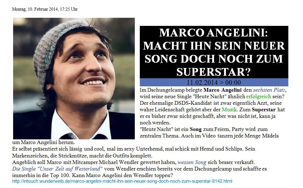 Keine drei Tage blieben Marco zwischen Dschungel und Tour, und dieses Mal warteten alle ganz besonders gespannt auf die Chartplatzierung: Marco hatte mit „dem Wendler“ gewettet, dass „Heute Nacht“ höher in die Charts einsteigen würde als Michaels aktuelle CD, die Platz 55 der deutschen Charts geschafft hatte. Wetteinsatz: der Titel „König des Popschlagers“, den Michael sich vor Jahren selbst verliehen hatte – bei einer Chartplatzierung von 54 oder höher wollte Michael diesen Titel an Marco abgeben. Kein geringer Wetteinsatz für Michael, aber er war sich seiner Sache sehr sicher …